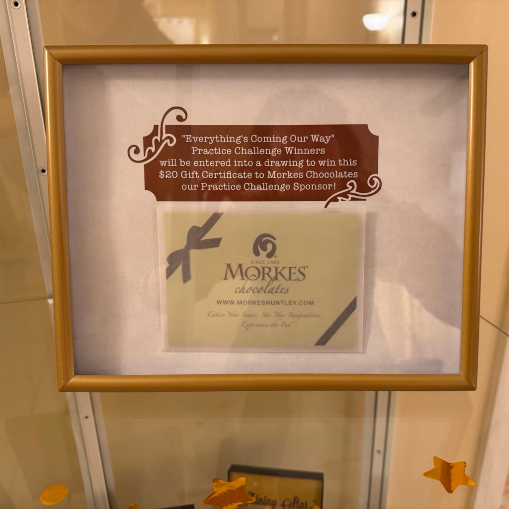 Our Virginia Piano “Everything’s Coming Our Way” Practice Challenge sponsored by Morkes Chocolates of Huntley has been exciting & motivating to students! Students that win the practice challenge (by completing their “circled pages” 6 of 8 weeks) receive a framed & personalized postcard & small gift, & are entered into a drawing for a $20 Morkes gift certificate!🍫